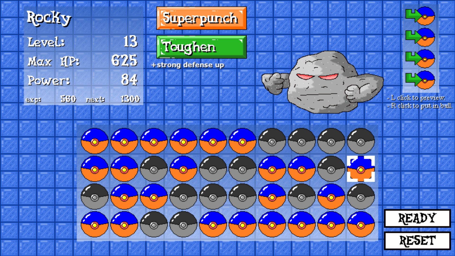You will always be carrying four carrier Uberballs with you which you can fill with any Ubermon you desire for your team. To do this, simply Left-click on an Uberball from the inventory, then Right-click on one of the four carrier Uberballs on the top-right corner of your screen to put it in. Once the carrier Uberballs are equipped, you can Left-click on them to preview the current Ubermon that it's holding. To reset your carrier Uberballs, just Left-click the "reset" button. When you start playing for the first time, you will begin with two randomly chosen starter Ubermon.